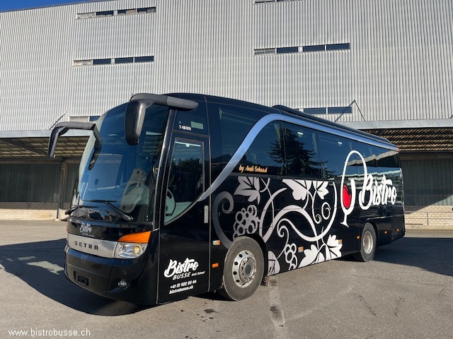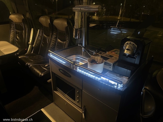 29 Fahrgäste 2 Tische mit je 4 Plätzen & 1 Tisch mit 5 Plätzen Bordküche in der Mitte des Busses. Warmluftofen, Kühlschränke, Kaffeemaschine und Zapfhahnen Toilette beim hinteren Einstieg