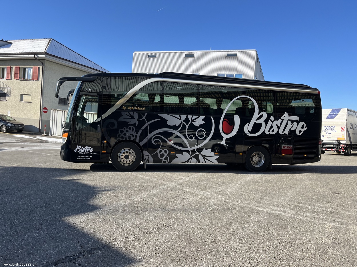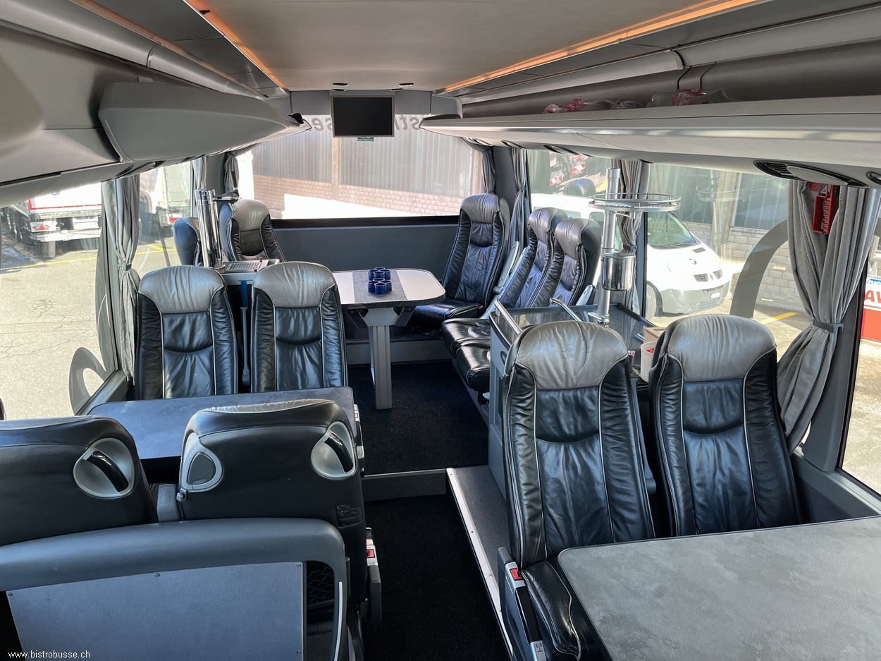 29 Fahrgäste 2 Tische mit je 4 Plätzen & 1 Tisch mit 5 Plätzen Bordküche in der Mitte des Busses. Warmluftofen, Kühlschränke, Kaffeemaschine und Zapfhahnen Toilette beim hinteren Einstieg